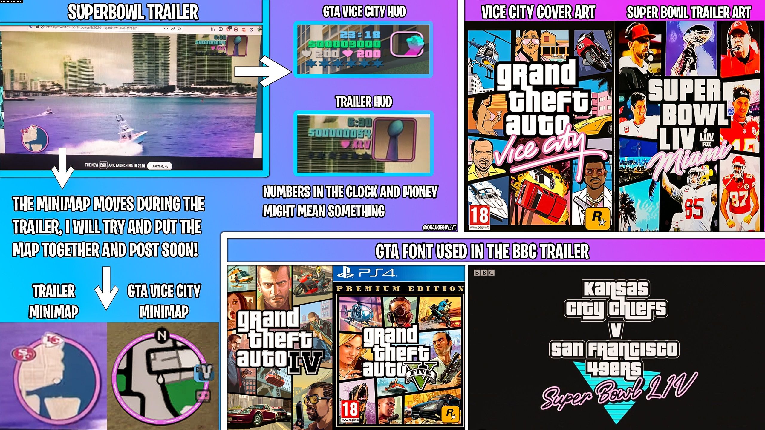 Innym przykładem wątpliwego teasera była reklama 54. edycji Super Bowl. W ramach transmisji tegorocznych mistrzostw w futbolu amerykańskim stacje BBC oraz Fox Sports wykorzystały interfejs, który był aż nazbyt wyraźnie wzorowany na tym z Grand Theft Auto: Vice City. Porównanie z serwisu Reddit opublikowane przez użytkownika IsThatOrangeGuy nie pozostawia większych wątpliwości co do inspiracji.