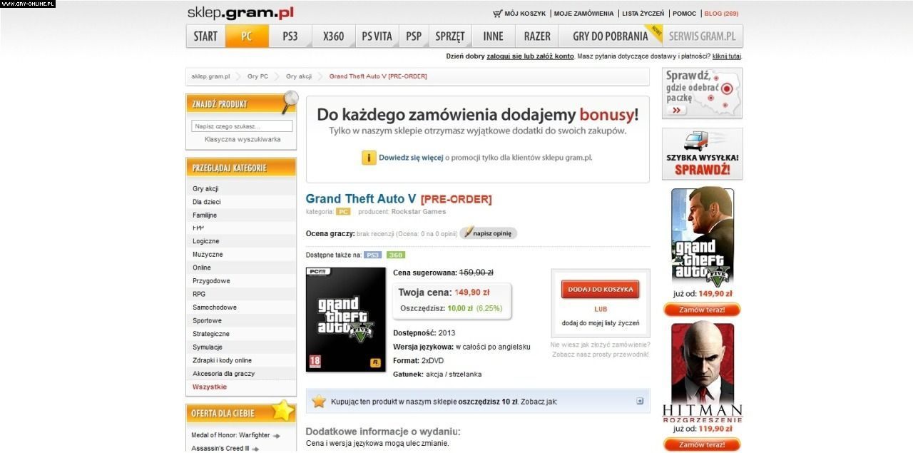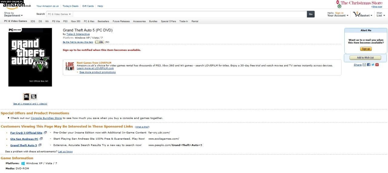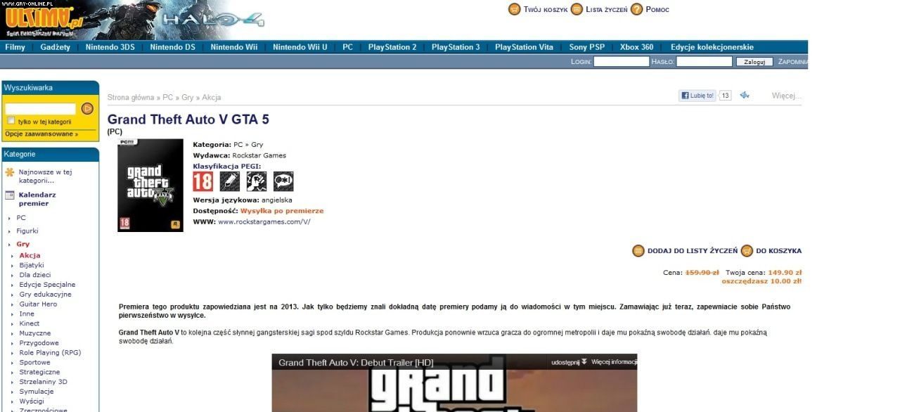 Losy pecetowej wersji Grand Theft Auto V wciąż są nierozstrzygnięte – firma Rockstar jak zwykle niechętnie wypowiada się na temat wydania gry na blaszakach. Tym bardziej zaskakujące jest to, iż w kilku sklepach internetowych, w tym na Amazonie oraz w rodzimym muve.pl – sklepie polskiego wydawcy gry, firmy Cenega – można już zamawiać pre-ordery GTA V na PC. Zobaczcie sami: