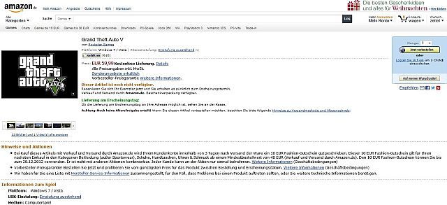 Zwróćcie uwagę, że zarówno Polacy, jak i Niemcy podali cenę gry. Amazon.de za piątą część gangsterskiej serii od Rockstara żąda 59,99 euro. W polskich sklepach ceny są rzecz jasna odpowiednio niższe, choć zastanawia widoczna pomiędzy nimi rozbieżność. Według gram.pl i ultima.pl cena sugerowana GTA V na PC wynosi 159,90 złotych, podczas gdy na muve.pl słynącym z korzystnych ofert trzeba zapłacić aż 169,90 zł. Tu również powstaje pytanie: czy informacje te znajdą w przyszłości pokrycie, czy też jest to zwkła próba wstrzelenia się w okolice prawdopodobnej ceny gry? Jest to możliwe, tym bardziej, że gram.pl zaznacza, że cena i wersja językowa (obecnie na stronie figuruje jedynie angielska) mogą ulec zmianie.