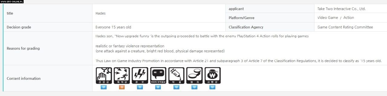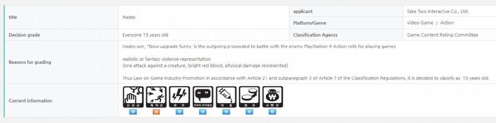 Wygląda na to, że Hades, hit studia Supergiant Games, zmierza na konsolę PlayStation 4. Użytkownik modiz z portalu ResetEra odkrył bowiem, że Koreański Komitet do spraw Klasyfikacji i Administracji Gier sklasyfikował wydaną w ubiegłym roku na PC i Switcha produkcję jako dozwoloną dla osób od piętnastego roku życia – właśnie na konsoli Sony. Dowód możecie zobaczyć poniżej.