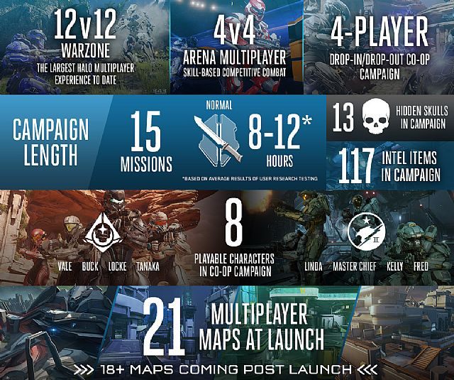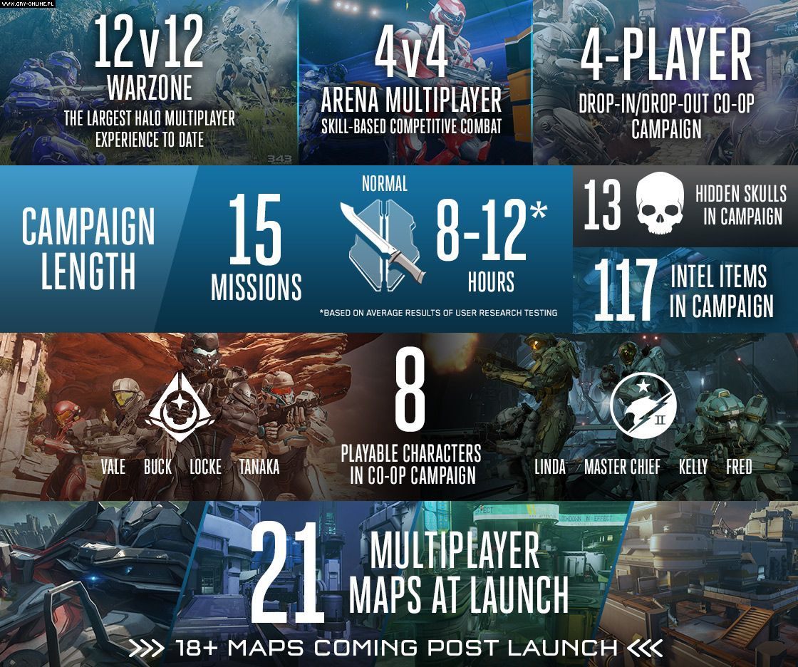 Jeżeli chodzi o kampanię fabularną, autorzy zapowiadają rozgrywkę trwającą około 8-12 godzin i zamykającą się w obrębie 15 misji. W trakcie jej trwania możemy wcielić się w jedną z 8 postaci i pobawić się w sieciowym trybie kooperacji dla maksymalnie 4 graczy. Grafika przypomina również o zbliżającym się turnieju Halo World Championship, w którym pula nagród wyniesie 1 milion dolarów.