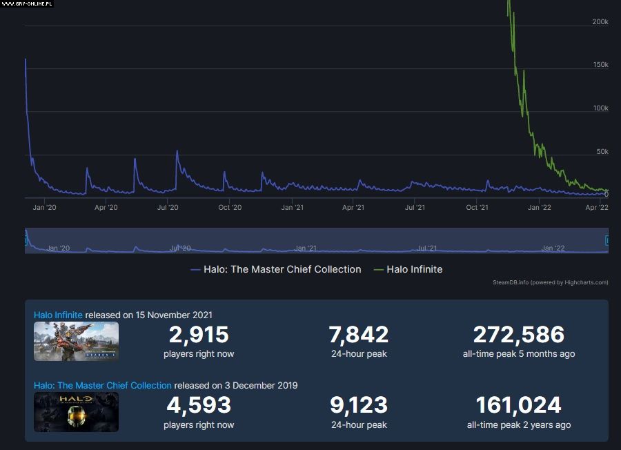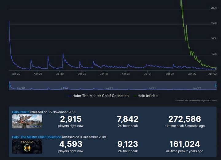 Żadna z tych pozycji nie załapała się do pierwszej setki najpopularniejszych produkcji na Steamie. Rzut oka na dane z serwisów SteamDB i Steam Charts dobitnie pokazują spadek formy nowszej gry z Master Chiefem.