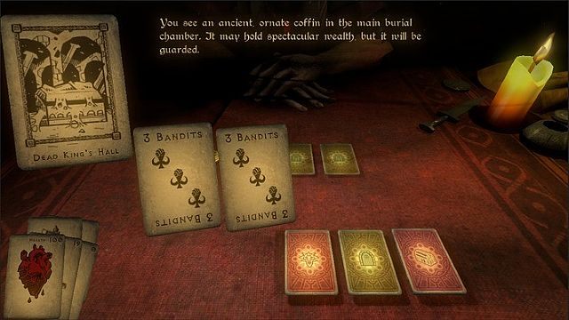 Jak przystało na karciankę, nie brakuje tu również elementu składania własnej talii, w skład której wchodzą części ekwipunku, specjalne ataki i inne bonusów nabywane w toku wędrówki. Zabawa polega jednak na tym, że Rozdający miesza ze sobą karty spotkań – czyli owe rozmaite przygody – oraz naszą talię. Dlatego rozgrywka za każdym razem może przybierać inny przebieg, jako że nigdy nie wiemy, kiedy trafimy na swoje artefakty i z jakim stanem posiadania przyjdzie nam się zmierzyć z konkretnymi zagrożeniami. Karty występujące w grze przypominają tarota, a celem protagonisty jest pokonanie Waleta (Jopka), Damy i Króla z każdego koloru kart.