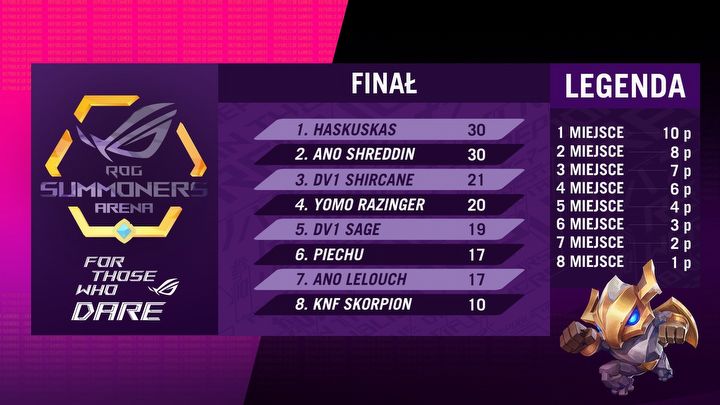 Do ROG Summoners Arena zgłosiło się w sumie ponad 600 zawodników, którzy przez ostatni miesiąc walczyli o jak najlepsze lokaty. Rozgrywki prowadzone był w formie turniejowej – od otwartych kwalifikacji, przez play-offy, aż do wielkiego finału. Uczestnicy oprócz nagród w postaci pieniężnej oraz laptopa ASUS ROG Strix Scar 15 walczyli również o unikalny puchar w postaci Małej Legendy!