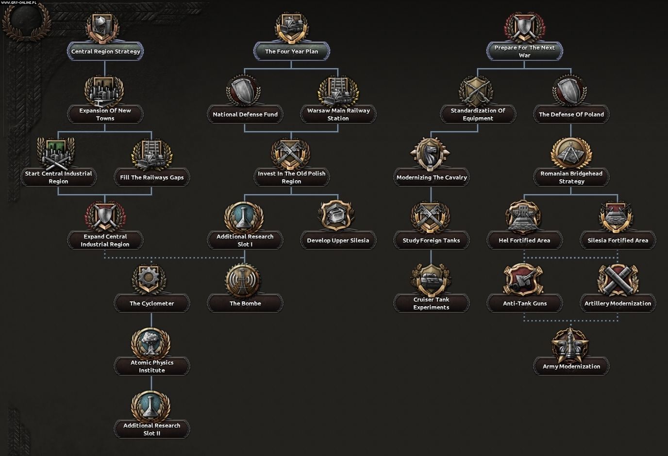 Pełną informację na temat Poland: United and Ready znajdziecie na forum Paradox Interactive pod tym adresem. Obejmując dowodzenie nad naszym państwem otrzymamy oczywiście osobne drzewko rozwoju, portrety przywódców, generałów i ministrów, trójwymiarowe grafiki kawalerii i bardziej znanych czołgów oraz samolotów, a także nowe osiągnięcia i wydarzenia. Deweloperzy odrobili też lekcję z historii: podstawą industrializacji Polski jest Plan Czteroletni z czasów II Rzeczypospolitej, zgodnie z wizją Piłsudskiego możemy postulować stworzenie Międzymorza, zaś podczas II wojny światowej mamy wyraźną przewagę nad resztą krajów w próbach rozszyfrowania niemieckiej Enigmy. Niestety, wierność historycznym realiom ma też złe strony: jako państwo z jednej strony graniczące z III Rzeszą, z drugiej ze Związkiem Radzieckim, nie mamy szans, by stawić czoła ekspansji. Możemy za to wykorzystać nowe opcje dyplomatyczne, by szukać protekcji lub nawet sojuszu z Niemcami lub Sowietami.