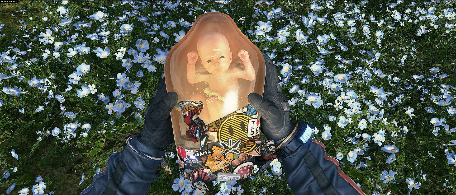 Ostatnią grę Hideo Kojimy możemy wręcz rozkładać na czynniki pierwsze i praktycznie w każdym z elementów natkniemy się na coś dziwnego. To w końcu gra z historią kręcącą się wokół postaci BB – płodu zamkniętego w słoiku, z którym gracza łączy się w zasadzie za sprawą sztucznej pępowiny. Tę znów można postrzegać w kategorii metafory wspomnianej liny, co idealnie współgra z charakterem więzi, jaką gracz i główny bohater nawiązują z BB w trakcie kolejnych wydarzeń, pomijając już niuanse fabularne i narracyjne. Płód z Death Stranding ma bezpośrednie zastosowanie w rozgrywce i pełni funkcję użytecznego ekwipunku. Reaguje na zagrożenie i pozwala bohaterowi dostrzegać rzeczy nadnaturalne. Musimy dbać o jego stan, a nawet uspokajać poprzez kołysanie.