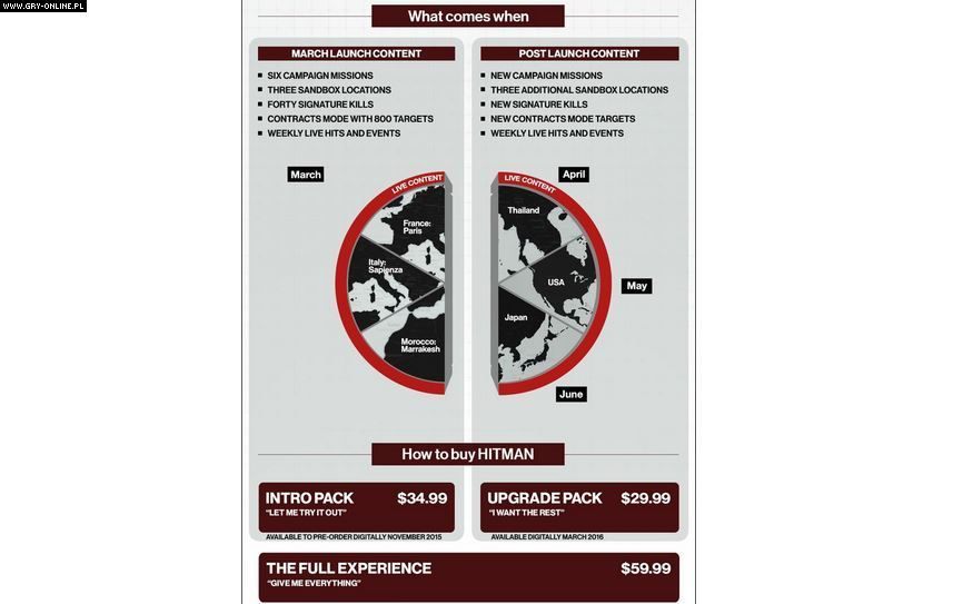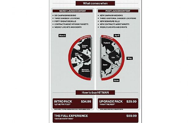Twórcy ze studia Io-Interactive przedstawili zawartość gry Hitman w dniu premiery, a także plany rozszerzania jej o kolejne aktualizacje. Podali również ceny poszczególnych elementów tytułu oraz datę jego premiery.