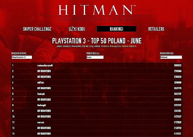 Niestety, co widać na załączonych rankingach, wielu graczy nie skojarzyło jeszcze swojego konta z tablicą wyników na https://www.hitmansniper.com, tym samym nie możemy się z nimi skontaktować. A warto to zrobić, bo już wkrótce wystartuje konkurs dla wszystkich biorących udział w turnieju i zarejestrowanych na stronie z wynikami. Do wygrania atrakcyjne nagrody! Połączenie kont, niezależnie od platformy gry, to łatwa i krótka procedura (wystarczy kliknąć w łącze „Musisz połączyć swoje konta” na tablicy wyników i postępować zgodnie z dalszymi procedurami na ekranie), a już wkrótce okaże się, że naprawdę warto to zrobić.
