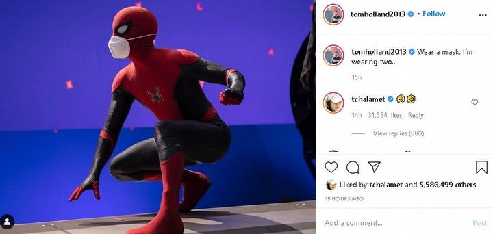 Informowaliśmy ostatnio o tym, że Tom Holland, odwtórca roli Spider-Mana w najnowszych filmach należących do Marvel Cinematic Universe, otrzymał scenariusz do trzeciej części przygód Człowieka-Pająka. Teraz wiemy także, że oficjalnie rozpoczęto prace produkcyjne nad filmem, co potwierdza nieco humorystyczne zdjęcie z planu wrzucone przez aktora na swój profil na Instagramie. Widzimy na nim młodego superbohatera w dobrze nam w tych czasach znanej maseczce na twarz. Na post Hollanda odpowiedział między innymi inny hollywoodzki gwiazdor Timothée Hal Chalamet (zagra on między innymi główną rolę w nadchodzącej Diunie). Zarówno fotografię, jak i krótką dyskusję aktorów znajdziecie poniżej.