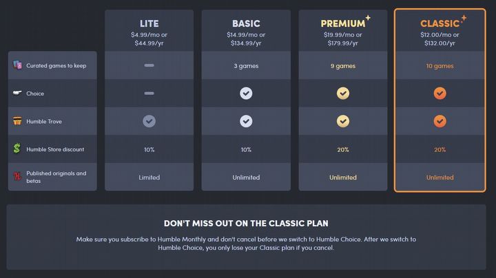 Kluczem do zrozumienia wprowadzanych zmian jest dodatkowa opcja subskrypcji (poza jej tańszymi i mocno ograniczonymi wersjami Lite i Basic) o nazwie Classic, przeznaczona dla starych użytkowników Humble Monthly. Po starcie Humble Choice dotychczasowi klienci serwisu korzystać będą bowiem z niego w kompletnie niezmieniony sposób, w tej samej formule i z tym samym planem opłat wynoszącym 12 dolarów miesięcznie. Jeżeli jednak przerwą oni choć na miesiąc subskrypcję, po powrocie będą zmuszeni do wykupienia mniej atrakcyjnego planu Premium. Wydaje się więc, że rewolucja w serwisie, zamiast przyciągać nowych klientów, ma raczej na celu zatrzymać dotychczasowych abonentów, którzy w obawie przed utratą przywilejów i niższej ceny będą nadal regularnie płacić za serwis. Przez najbliższe tygodnie każdy zainteresowany będzie mógł jeszcze załapać się na abonament Classic, rejestrując się na stronie Humble Monthly. Po oficjalnym starcie Humble Choice możliwość ta przepadnie na zawsze.