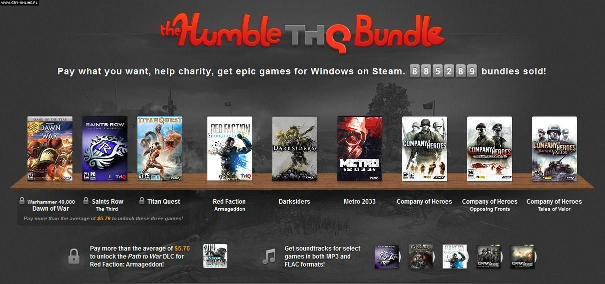 Humble THQ Bundle było pierwszą odsłoną tej popularnej serii paczek koncentrującą się na tytułach jednego, dużego wydawcy. Wcześniej platforma sprzedawała głównie gry niezależne. W ramach akcji można było dostać takie produkcje jak Red Faction: Armageddon, Darksiders, Metro 2033, Company of Heroes, czy chociażby Saints Row: The Third dosłownie za kilkanaście złotych. Później paczka została poszerzona o dodatkowe elementy – w tym grę Dawn of War.