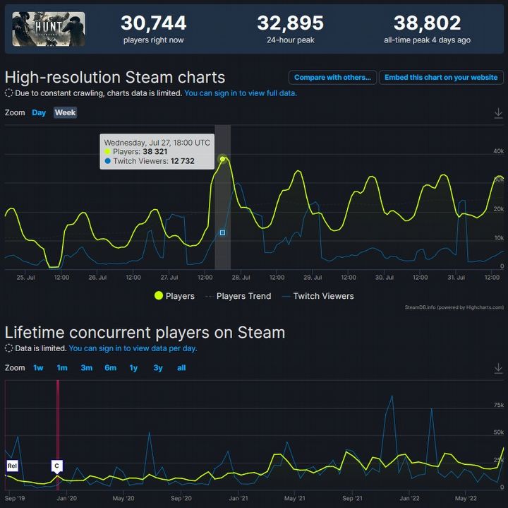 Im dalej od premiery Hunt: Showdown, tym większą popularnością cieszy się owa sieciowa produkcja studia Crtyek. Gdy w 2019 roku ukazała się ona na PC, grało w nią jednocześnie około 13 tys. użytkowników Steama. W ostatnich dniach, a konkretnie 27 lipca 2022 r., w tym samym czasie bawiło się zaś przy niej ponad 38 tys. graczy. Jest to najwyższy odnotowany wynik w niemal trzyletniej historii tytułu, a także w poprzedzającym ją okresie wczesnego dostępu.
