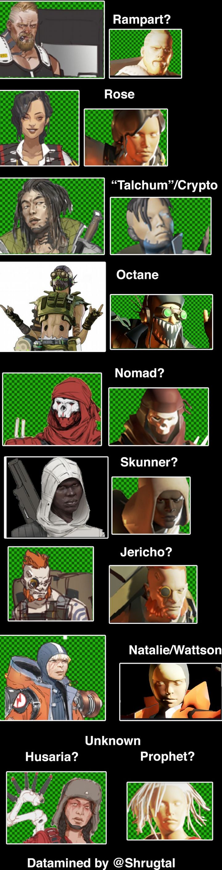Przede wszystkim hakerzy odnaleźli projekty nowych bohaterów mogących wkrótce pojawić się w grze. W grupie dziesięciu herosów (do obejrzenia poniżej) znalazł się Octane, o którym plotki krążą już od jakiegoś czasu. Mówi się, że zadebiutuje on jeszcze w tym miesiącu (być może nawet dziś), wraz z Battle Passem pierwszego sezonu. Prócz niego na opublikowanej przez graczy liście znaleźli się Rampart, Rose, „Talchum”/Crypto, Nomad, Skunner, Jericho, Natalie/Wattson, Prophet i Husaria (część imion nie jest pewna). Uwagę Polaków zwrócić może zwłaszcza ta ostatnia postać, która na pierwszy rzut oka wygląda jak stereotypowy Słowianin (może z wyjątkiem blond włosów) ze skrzydłami na plecach.
