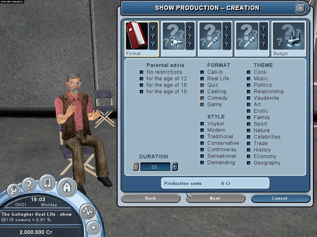 Do zadań gracza będzie należało nie tylko zatrudnianie kolejnych pracowników czy przygotowywanie programów tak, aby nie powstawały luki w audycji, ale również na jego głowę spadnie wiele spraw, związanych z finansami i kwestią oglądalności. Niejednokrotnie będzie się można przekonać, że utrzymanie widzów przed telewizorami to nie taka prosta sprawa. Jednak zdecydowanie trudniejsze okaże się szukanie firm, które chciałyby umieści na antenie prowadzonej stacji swoją reklamę oraz zgodziłyby się na proponowane warunki.