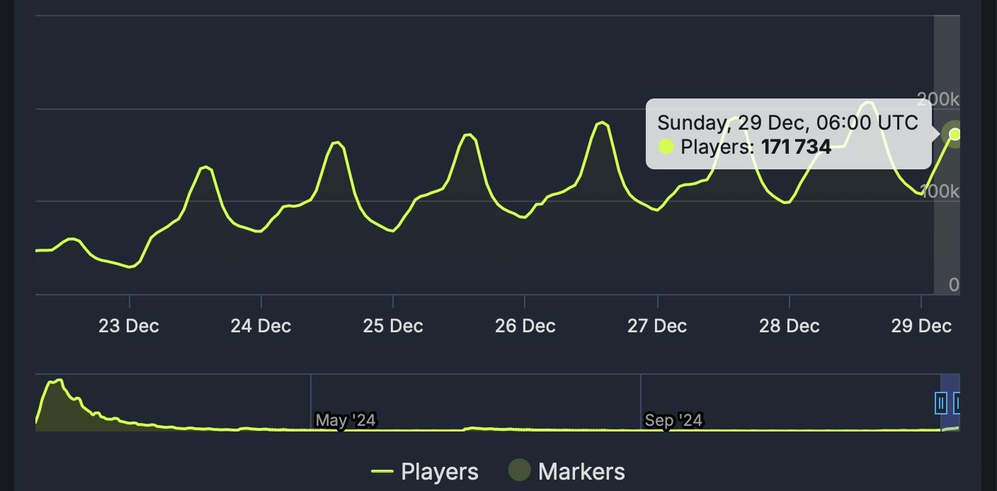 Obecnie na platformie firmy Valve w Palworld gra jednocześnie 175 tysięcy osób (via steamdb.info), a liczba aktywnych użytkowników w ciągu ostatniej doby osiągnęła „peak” na poziomie 206 tysięcy. Dodatkowo na przestrzeni ostatnich 30 dni produkcja może pochwalić się „przytłaczająco pozytywnymi” (96%) recenzjami (w liczbie 12 920), co przekłada się na całkowitą bazę ponad 357 tysięcy opinii, z których większość jest „bardzo pozytywna” (94%).