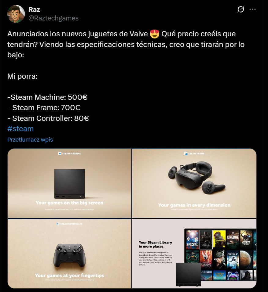 Rozstrzał cenowy w przypadku Steam Frame bywa naprawdę różny, ale dominują opinie, że będzie on kosztował poniżej 800 dolarów. Osobiście uważałbym, że cena w okolicach 500 dolarów jest całkiem realna – PSVR2 obecnie kosztuje 399 dolarów (z premierowych 549,99), z kolei niezależne Meta Quest 3 to koszt 329 dolarów. Jeśli Valve faktycznie chciałoby nieco „zawojować” przestrzeń VR i faktycznie dać jej szansę na nową falę popularności, to musiałoby zaoferować cenę podobną, a nawet niższą niż konkurencja. Dlatego chciałbym, aby ten sprzęt wyceniono w okolicach 400 dolarów.
