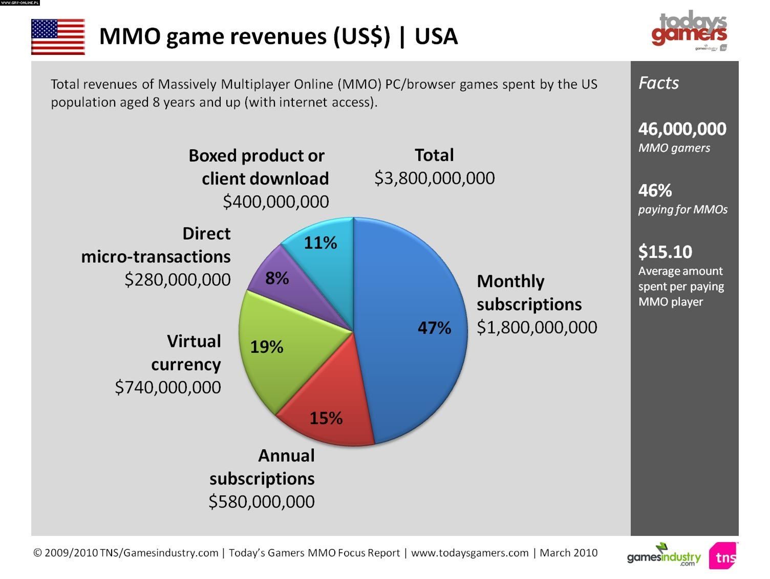 Opublikowany przez GamesIndustry.com raport wyraźnie pokazuje, że rynek gier MMO w USA i przebadanych krajach europejskich generuje coraz większe zyski, a gracze coraz częściej traktują dodatkowe opłaty jako dobrą inwestycję. Jednocześnie dane pokazują, że choć płacenie za gry MMO staje się coraz bardziej powszechne, nadal wielu graczy korzysta z darmowych rozwiązań. W USA wolną od opłat rozrywkę wybrało 25 milionów graczy MMO czyli 54% wszystkich, którzy sięgnęli po ten gatunek gier.