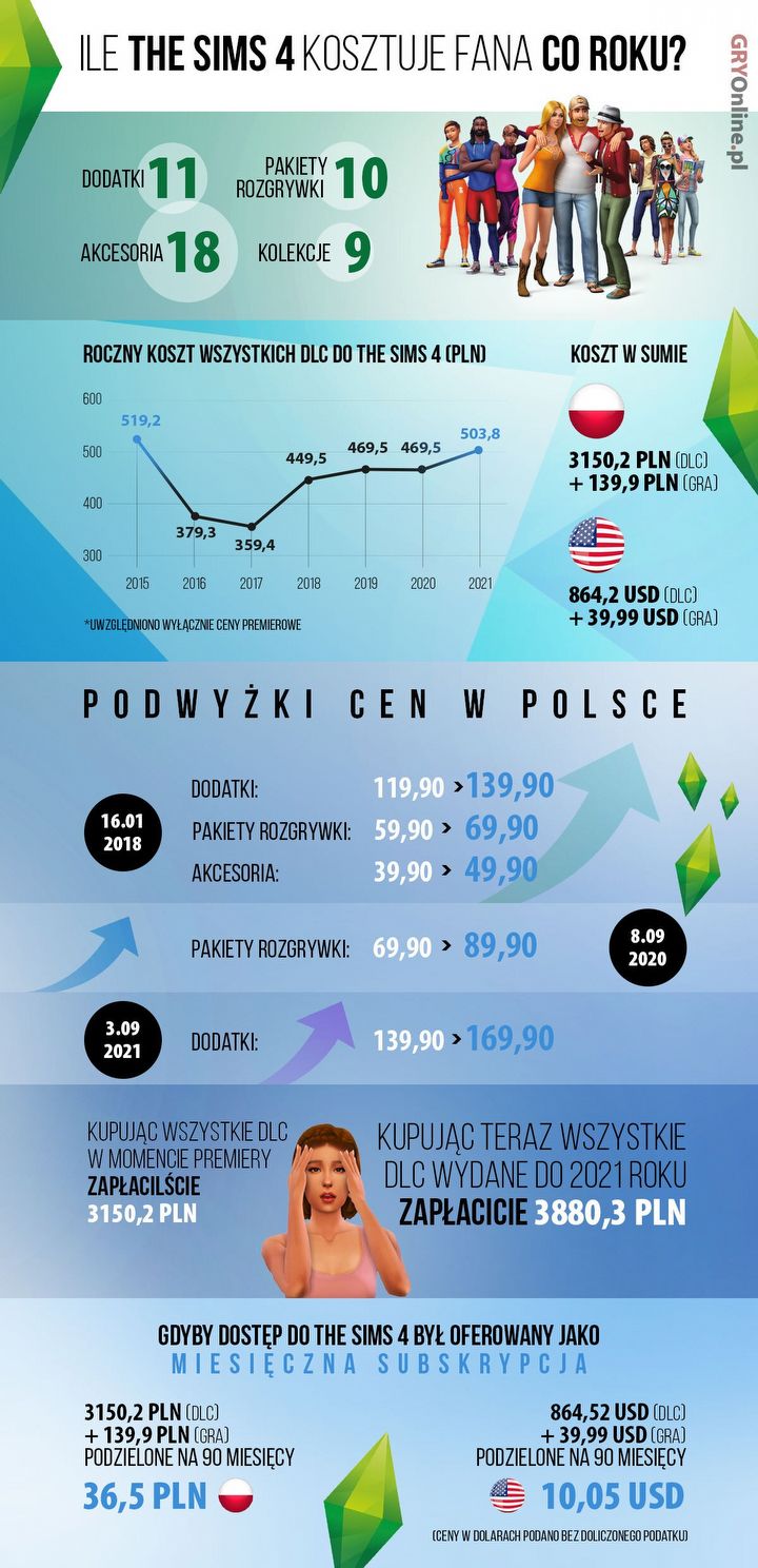 Jak duże? Policzyliśmy to i zobrazowaliśmy na poniższej grafice. Zawarliśmy na niej jedynie czterdzieści osiem DLC wydanych do końca 2021 roku, by porównywanie do siebie kolejnych lat miało jakikolwiek sens. W obliczeniach nie wzięliśmy więc pod uwagę wydanej 3 lutego kolekcji Karnawałowa moda oraz nadchodzącego pakietu rozgrywki Ślubne historie. Wciąż jednak jest bardzo drogo.