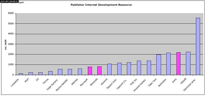 Nad grami EA pracuje aktualnie ponad 5.000 osób, co jest wynikiem blisko trzy razy lepszym od tego, który został osiągnięty przez UbiSoft – drugą firmę w zestawieniu. Ostatnie miejsce na tym szczególnym podium przypadło korporacji Sony, jednemu z trzech głównych producentów konsol, który może się pochwalić zespołem składającym się z około 2.100 pracowników. Firmy Nintendo oraz Microsoft uplasowały się na początku drugiej dziesiątki z wynikami poniżej 1.000 osób.