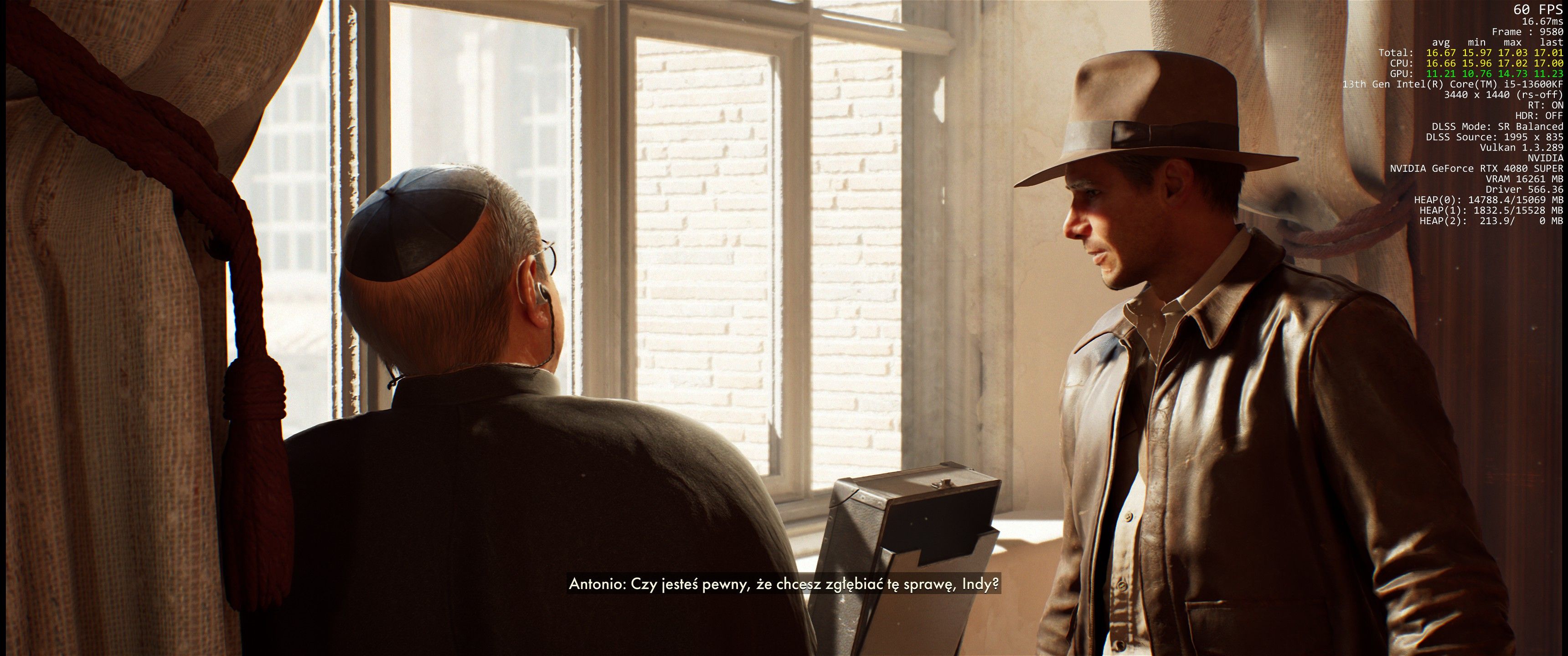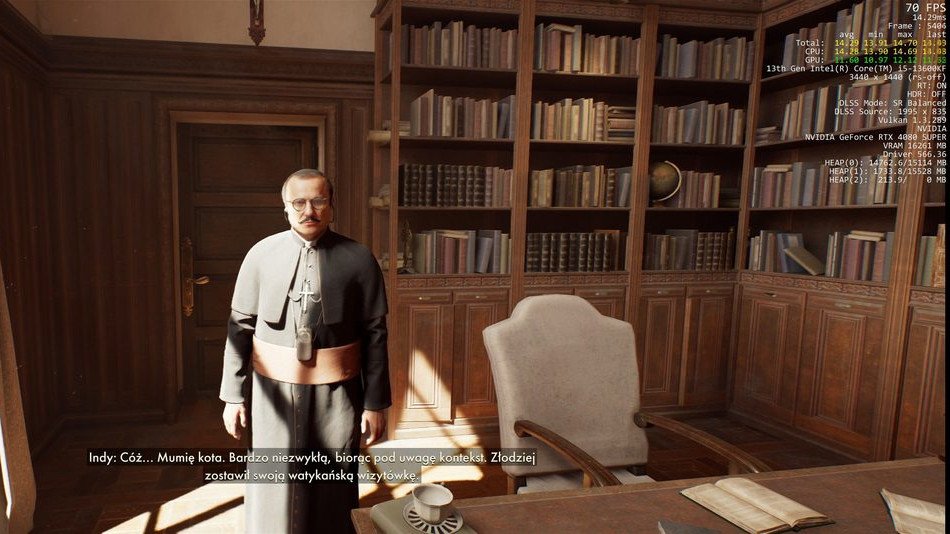 Pomimo początkowych obaw o optymalizację i bardzo wysokie (na papierze) wymagania sprzętowe, Indiana Jones i Wielki Krąg to jedna z najlepiej zoptymalizowanych gier roku. Na dodatek absolutnie zachwyca oprawą graficzną. Podczas całego czasu spędzonego z grą nie doświadczyłem ani jednej ścinki związanej z buforowaniem shaderów, które trapią gry tworzone na Unreal Engine 5. Nie miałem też żadnego problemu ze stabilnością fpsów czy frametime’u, rozgrywka zawsze działała płynnie (na odpowiednich ustawieniach graficznych). Jestem też pozytywnie zaskoczony tym, że Indy nie obciąża zbytnio procesorów i nie powtarza katastrofalnych bottlenecków ze strony CPU, jak chociażby Dragon’s Dogma 2, Star Wars: Outlaws czy Stalker 2.