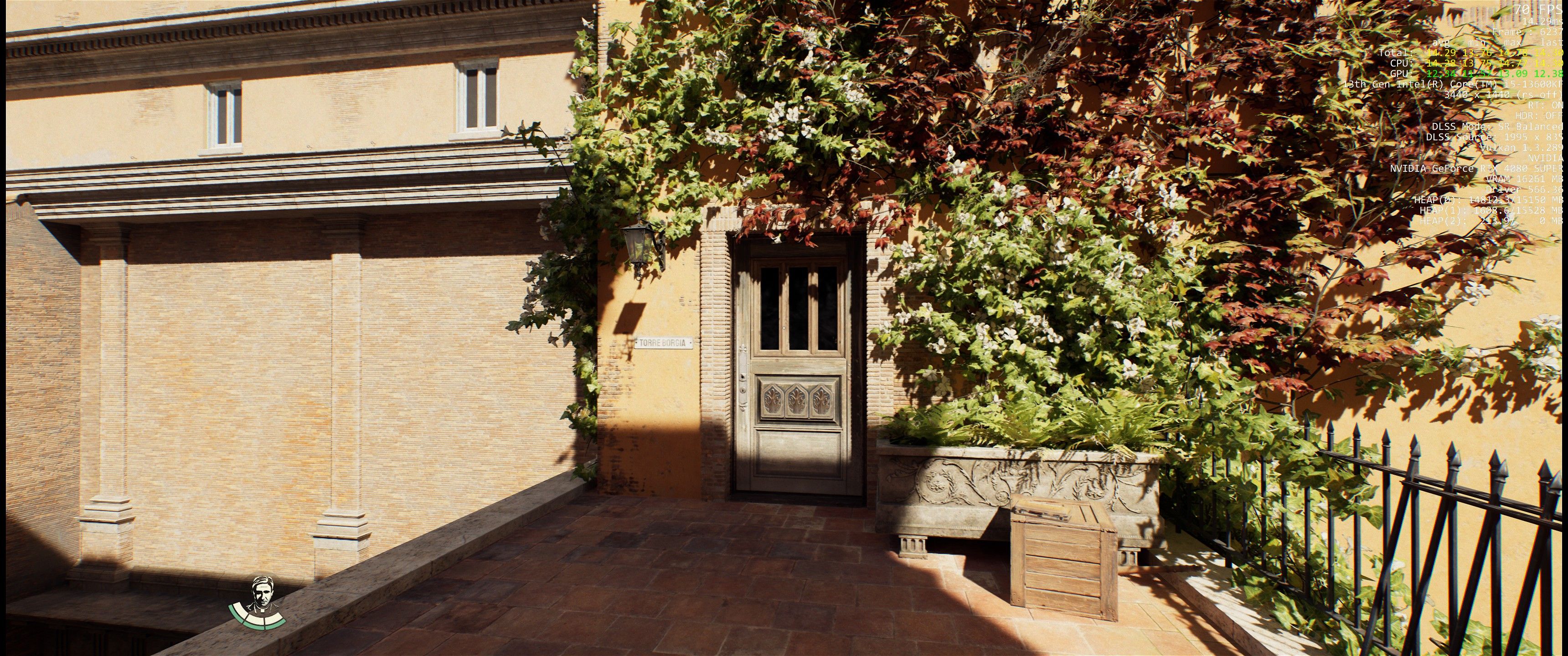 Zapewniam Was, że jeszcze lepsze wrażenie „śledzenie ścieżek” robi w ruchu. Przemieszczanie się po wąskich uliczkach Watykanu na maksymalnych ustawieniach z włączonym path tracingiem cieszy oko. Nieco mniej imponująco robi się, gdy główny bohater postanowi zejść do podziemi, bo tam siłą rzeczy ilość źródeł światła jest ograniczona. Jednak nawet wtedy można dostrzec, jak technologia ta wpływa na oświetlanie korytarzy pochodnią czy ogniem ziejącym z pułapek.