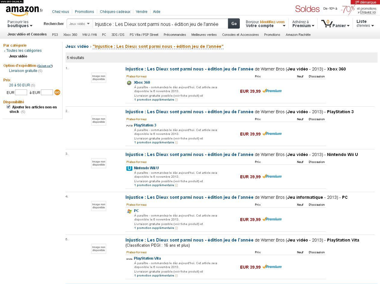 Sklepy internetowe sieci Amazon są bardzo często źródłem ciekawych pogłosek. Nie raz już okazywało się, że niezapowiedziana wcześniej na daną platformę sprzętową gra, niedługo po pojawieniu się na Amazonie zostawała oficjalnie ogłaszana przez wydawców. Czy w przypadku Injustice: Gods Among Us stanie się tak samo? Na francuskim Amazonie można odnaleźć ofertę edycji Game of the Year, która jakoby ma zadebiutować nie tylko na PlayStation 3, Wii U i Xboksa 360, ale także na PC oraz PlayStation Vita. Bogatsze wydanie gry, ze wszystkimi dodatkami DLC, miałoby ukazać się 6 listopada 2013 roku.