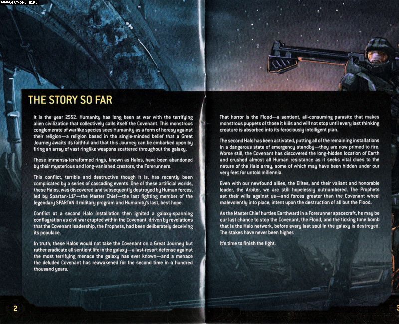 Halo 3 ukaże się 26 września, więc fani FPS-ów zaczęli nerwowo odliczać dni dzielące nas od premiery. W międzyczasie w sieci pojawiły się już skany instrukcji do tej produkcji, z których można się co nieco dowiedzieć na temat fabuły gry, sterowania (dla tych, którzy jeszcze nie grali), czy postaci.