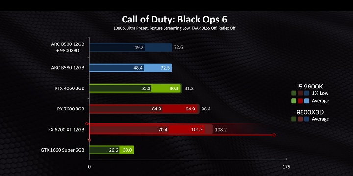 Wydajność B580 w grze Call of Duty: Black Ops 6. Źródło: Hardware Canucks.