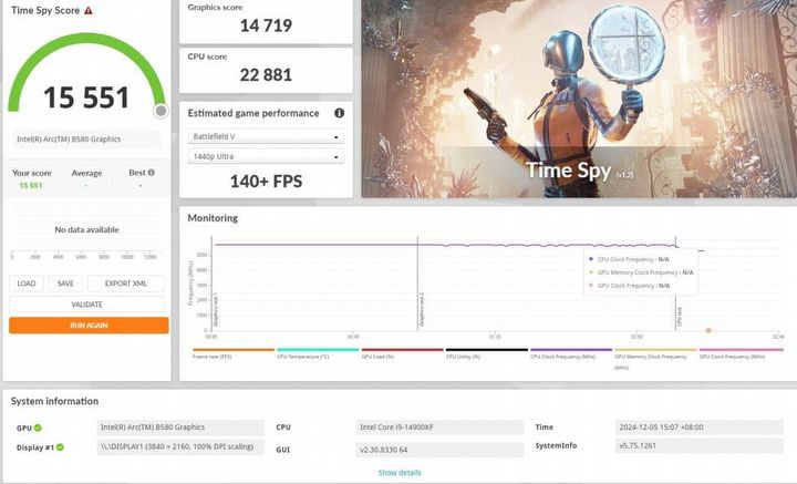 W teście Time Spy Arc B580 zebrał 15551 punktów (we współpracy z Core i9-14900KF). To całkiem sporo, biorąc pod uwagę, że RTX 4060 Ti w analogicznej konfiguracji osiągnął wynik 13873 pkt. Karta Intela okazała się więc o 12% wydajniejsza i bliżej jej do poziomu RTX 3080 (16134 punkty). Biorąc pod uwagę konkurencję najbliżej znajduje się Radeon RX 7700 XT z wynikiem 16454 punktów.