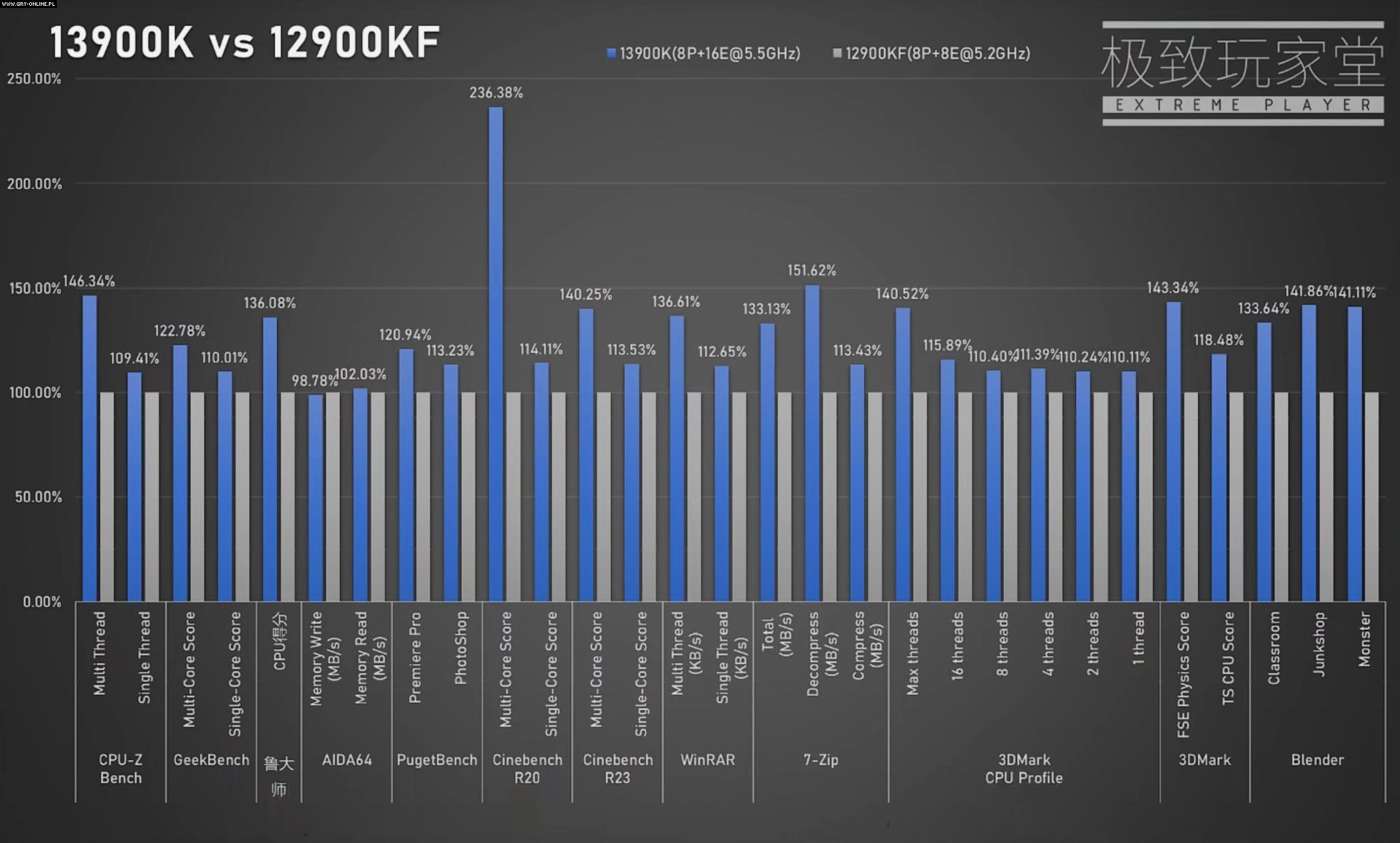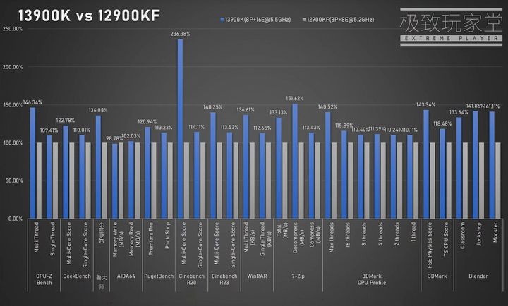 Jako pierwsza rzuca się w oczy efektywność wielowątkowa nowego procesora. W przypadku benchmarku Cinebench R32 wzrost wydajności wynosi aż 40,2% w porównaniu do i9-12900K. Podobnie sytuacja ma się w przypadku Geekbencha, w którym rezultat poprawił się o 23%. Jednak prawdziwą przewagę procesor pokazał w programie Cinebench R20, gdzie uzyskał wynik ponad 2,3 raza większy od swego poprzednika. Prawdopodobnie jest to spowodowane dodaniem ośmiu energooszczędnych rdzeni E.