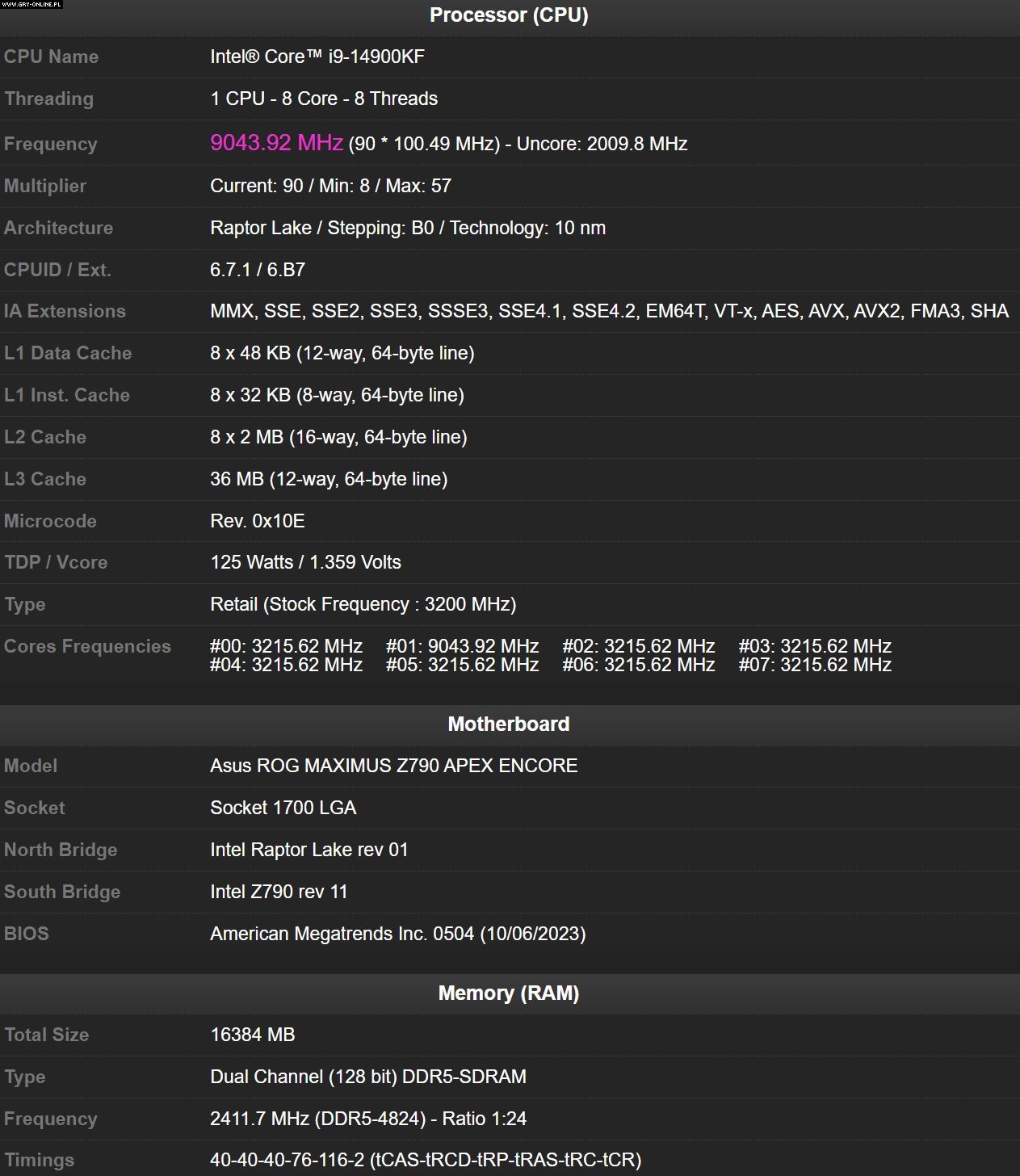Wykorzystując płytę główną ASUS ROG Maximus Z790 Apex Encore, zespół osiągnął częstotliwość taktowania procesora wynoszącą 9043,92 MHz. Jest to już kolejny raz, gdy udało się przekroczyć próg 9 GHz, zaś osiągnięcie zostało oficjalnie potwierdzone za pomocą narzędzia CPU-Z.