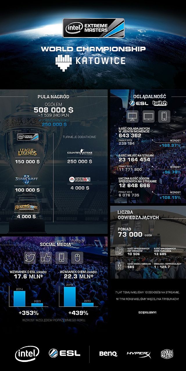 „Niewiele ponad sześć czy siedem lat temu byliśmy niezmiernie szczęśliwi gdy pojedynczy mecz śledziło 12 000 osób.” – mówi Michał Blicharz, Dyrektor Zarządzający d.s. ProGamingu w ESL. „Dziś 12 000 osób śledziło na żywo zmagania najlepszych graczy na świecie podczas Intel Extreme Masters Katowice a kolejne setki tysięcy przed ekranami swoich komputerów.”