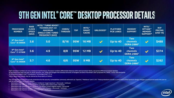 Nowe procesory koncernu z Santa Clara są kompatybilne z wszystkimi chipsetami z rodziny 300 bazującymi na podstawce LGA 1151 – zamontujemy je więc na płytach głównych z architekturą H310, B360, H370 oraz Z370 i Z390. Zostały one zaprojektowane w 14-nanometrowym procesie technologicznym i wszystkie posiadają odblokowany mnożnik, umożliwiający ich podkręcanie. W osiąganiu lepszych rezultatów w overclockingu pomoże nowe rozwiązanie, jakim jest lutowany bezpośrednio na procesorze rozpraszacz ciepła, skuteczniej odprowadzający nadmiar ciepła w porównaniu do tradycyjnej pasty termoprzewodzącej. Nowe CPU wyposażono także w kontrolery pamięci DDR4-2666 MHz oraz zintegrowane układy graficzne Intel UHD Graphics 630.
