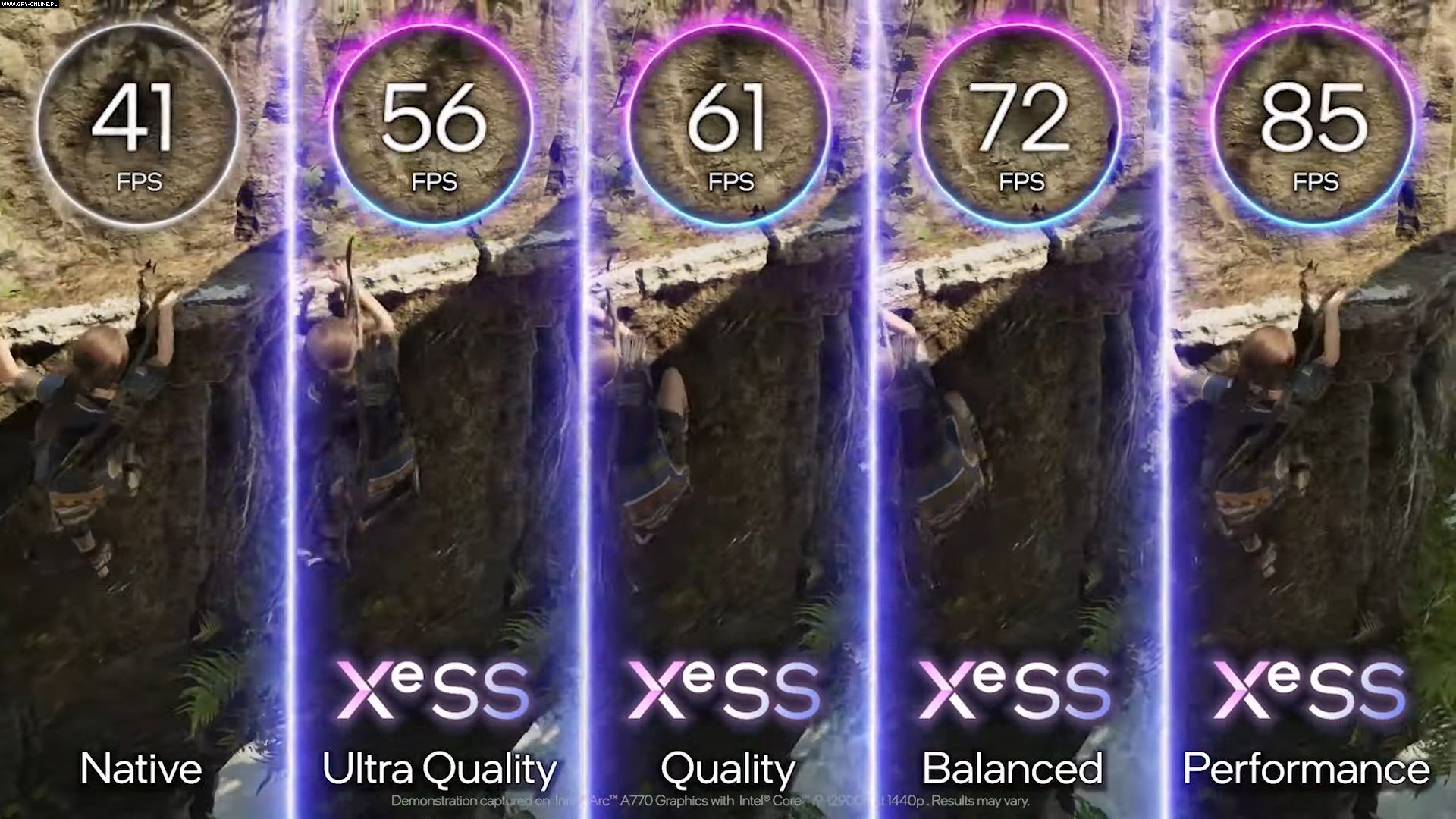 Dzięki tej technologii karta Intel ARC A770 uzyskiwała około 60-80 klatek na sekundę w Shadow of the Tomb Raider w 1440p z włączonym ray tracingiem na maksymalnych ustawieniach graficznych. Bez wykorzystania XeSS układ graficzny generował obraz z prędkością 40-50 klatek na sekundę. Omawiana technologia, podobnie jak inne tego typu oprogramowanie, posiada kilka różnych trybów: