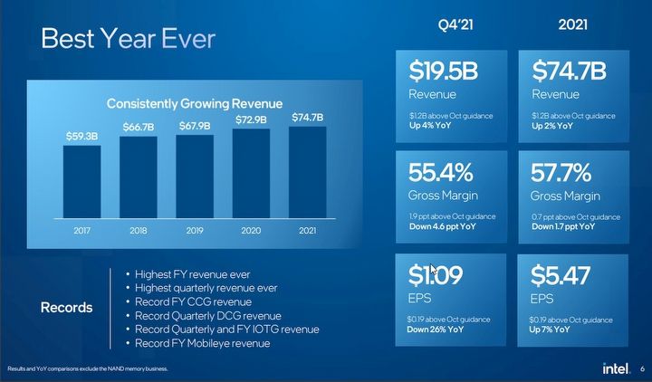 Spółka odnotowała najwyższy przychód w historii, zarówno w całym roku (74,7 miliarda dolarów), jak i w jego ostatnim kwartale (19,5 mld dol.). Zarazem w obu przypadkach odnotowano niższy przychód netto i to aż o 21% w końcówce roku. Co więcej, sektor Client Computing Group (obejmujący głównie sprzedaż procesorów do PC i laptopów) zaliczył w czwartym kwartale 2021 roku spadek, tym razem o ponad 7%. To efekt znacznie mniejszej sprzedaży laptopów niż rok temu, czego nie zrekompensował nawet wzrost cen (średnio o 14%).