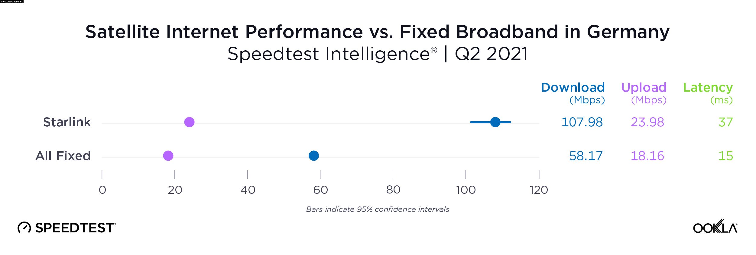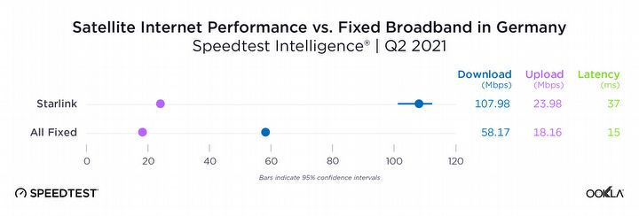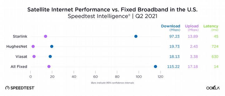 Ookla porównała Starlink z takimi alternatywami jak HughesNet czy Viasat, a także ze stacjonarnymi łączami szerokopasmowymi. Testy wykazały, że Internet od Muska znacznie przewyższył pozostałe dwie firmy satelitarne, plasując się niemal tak wysoko jak „standardowe” łącze. W raporcie można zauważyć, że Starlink był jedynym dostawcą, którego mediana opóźnienia zbliżyła się do stałych połączeń szerokopasmowych.