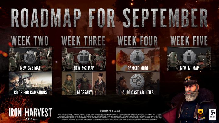 Gra Iron Harvest zadebiutowała na komputerach osobistych 1 września. Jej autorzy, czyli niemieckie studio KING Art Games, nie biorą jednak urlopu i zapowiadają, że w nadchodzących tygodniach ich dzieło będzie regularnie otrzymywać paczki nowej zawartości (via PC Gamer). Jakie atrakcje dla nas przygotowują? Mowa przede wszystkim o trybie współpracy oraz nowych mapach do trybu PvP. Poniżej czeka na Was oficjalna infografika i jej omówienie.