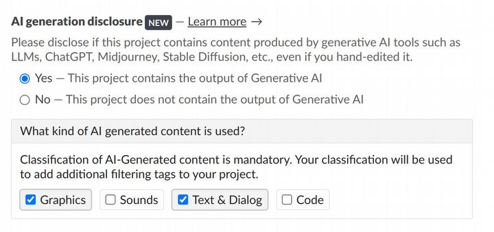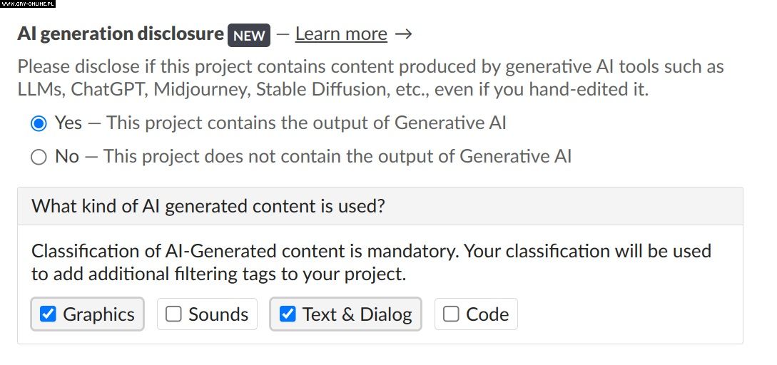 Jak czytamy, nowy obowiązek dotyczy wszelkiej zawartości tworzonej z pomocą generatywnej AI: nie tylko grafiki, dźwięku i tekstu, ale też kodu źródłowego. Wszystkie takie projekty otrzymają specjalny tag, plus dodatkowe podkategorie w zależności od tego, co „stworzyła” sztuczna inteligencja na potrzeby danego tytułu.