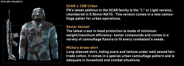 Co jednak ciekawsze, wszyscy, którzy złożą przedpremierowe zamówienia otrzymają darmowe DLC zawierające unikatowe przedmioty (widoczne na obrazku powyżej): lekki hełm kevlarowy pokryty kamuflażem, wojskową kurtkę w moro oraz modułowy karabin automatyczny SCAR-L CQB Urban na amunicję 5.56 NATO przystosowany do walki w terenie miejskim. Takie wyposażenie z pewnością wpłynie na morale niejednego najemnika. Nie wiemy jednak czy DLC będzie dostępne w późniejszym terminie dla pozostałych graczy. Pewnym jest tylko, że żadnego z tych trzech przedmiotów nie znajdziemy w grze.