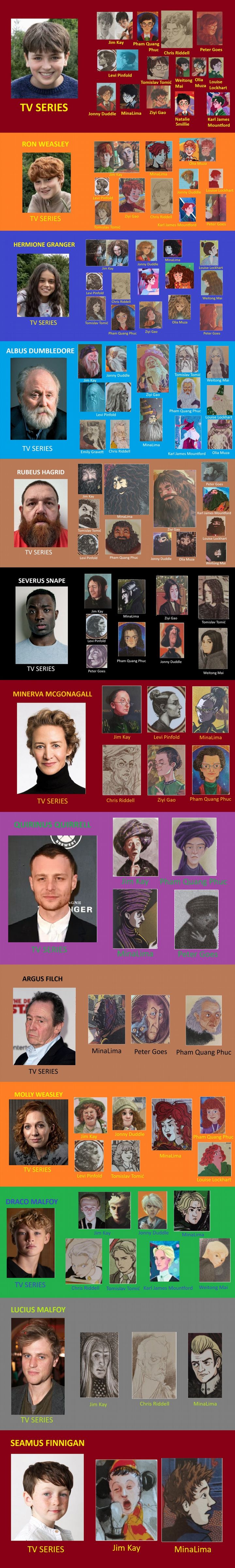 Użytkownik Reddita Luke_Gki podjął się wyzwania stworzenia porównań zdjęć aktorów i ilustracji z angielskich wydań książek Harry Potter. Na razie podzielił się porównaniami z Harrym Potterem (Dominic McLaughlin), Ronem Weasleyem (Alastair Stout), Hermioną Granger (Arabella Stanton), Albusem Dumbledore’em (John Lithgow), Rubeusem Hagridem (Nick Frost), Severusem Snape’em (Paapa Essiedu), Minervą McGonagall (Janet McTeer), Quirinusem Quirrellem (Luke Thallon), Argusem Filchem (Paul Whitehouse), Molly Weasley (Katherine Parkinson), Draco Malfoyem (Lox Pratt), Luciusem Malfoyem (Johnny Flynn) i Seamusem Finniganem (Leo Earley).