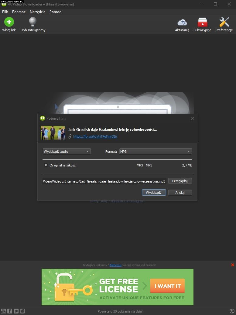 Trzecią z metod jest skorzystanie z zewnętrznej aplikacji. W tym wypadku jednym z najlepszych rozwiązań będzie program 4K Video Downloader, który pobierzemy z jego oficjalnej strony internetowej. Warto odnotować, że darmowa wersja tej aplikacji wyświetla reklamy na dolnym pasku; ponadto pozwala na pobieranie 30 filmów dziennie.