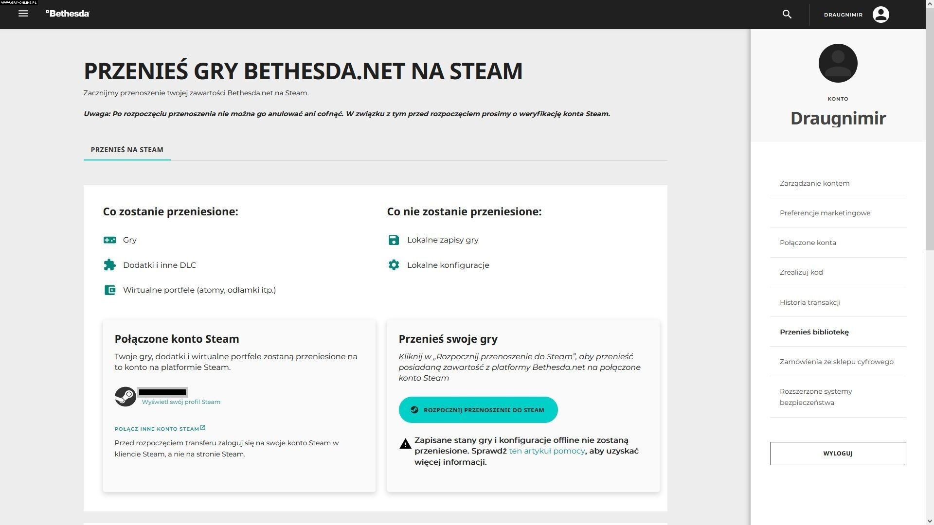 Po rozpoczęciu procesu przenoszenia nie można anulować ani też cofnąć go po zakończeniu. Gdy już przeniesiemy konto Bethesda.net na Steama, gry w launcherze Bethesda.net na PC nie będą dłużej dostępne poprzez niego, a tylko na platformie firmy Valve.