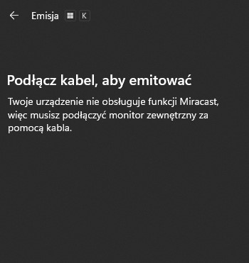 Warto odnotować, że jeśli nasz telewizor nie obsługuje technologii Miracast, naszym oczom ukaże się następujący komunikat: