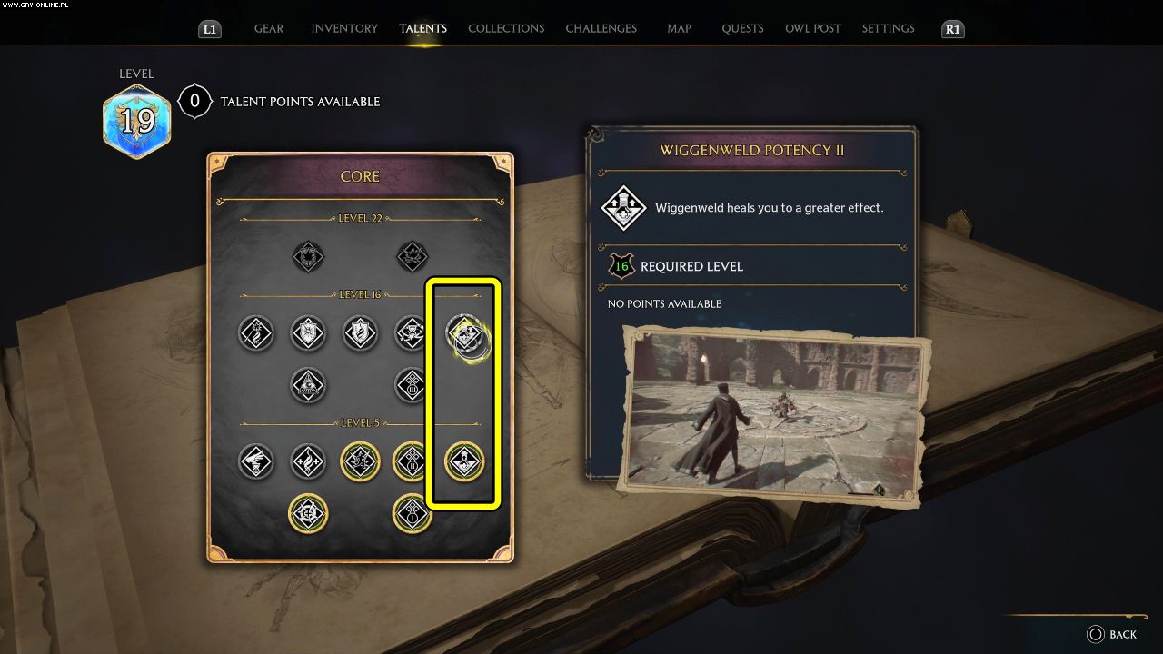 Wraz z awansowaniem na kolejne poziomy, Wasza postać otrzyma punkty Talentów. Punkty te możecie wydać na wzmacnianie zaklęć oraz innych zdolności. W zakładce Podstawowe (Core) znajdziecie Talenty Moc Wiggenowa I i Moc Wiggenowa II. Wykupienie ich to jedyny sposó na wzmocnienie efektów działa eliskiru leczniczego.
