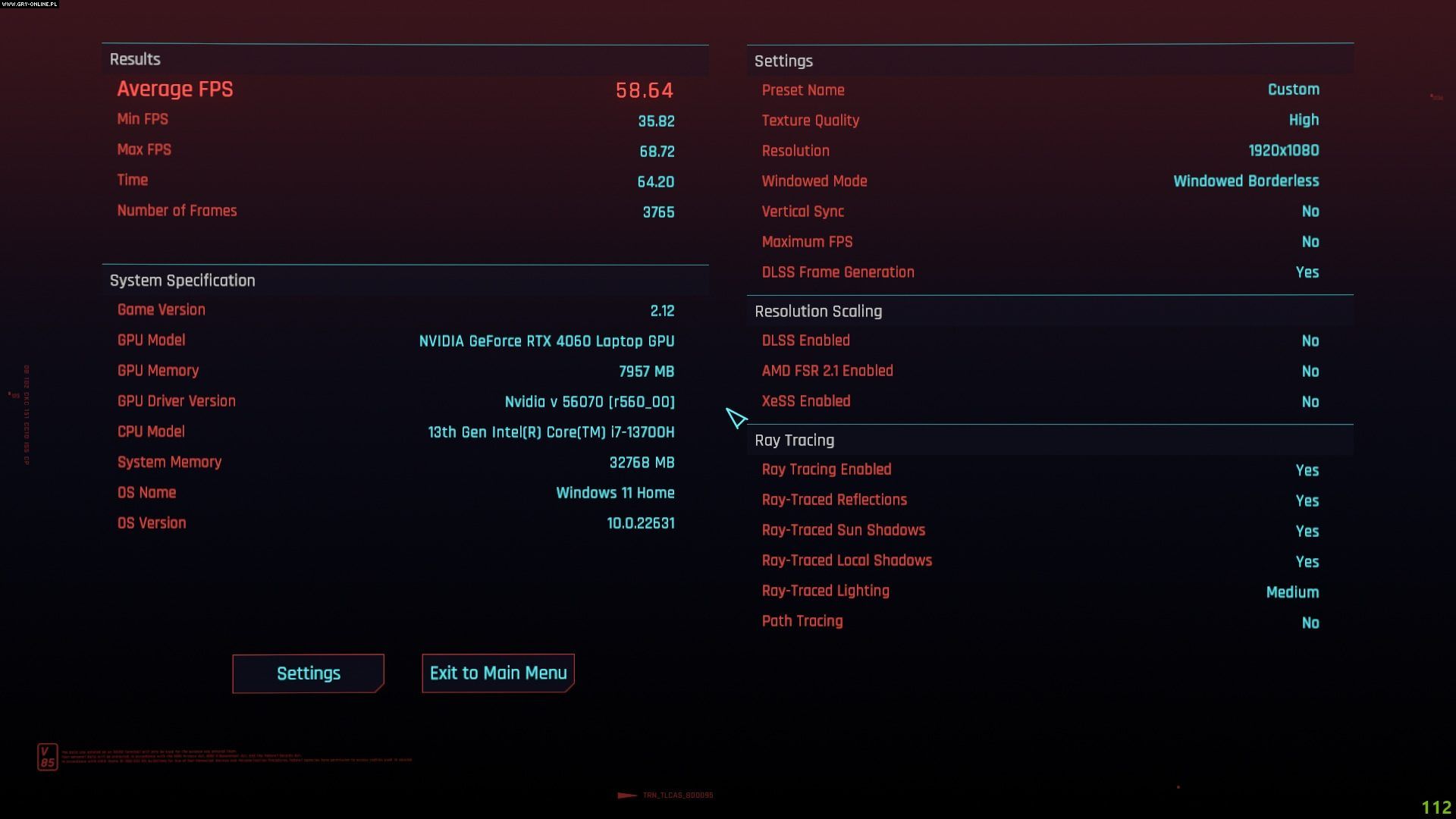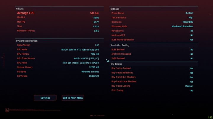 Na pierwszy ogień poszedł nasz rodzimy Cyberpunk 2077, który w obecnej wersji robi wrażenie wyglądem grafiki nawet bez modów. Dodatkowo, wbudowany w grę benchmark pozwala szybko przetestować różne ustawienia grafiki i sprawdzić, ile średnio FPS-ów można uzyskać. Wysokie ustawienia z RTX bez generowania klatek, bez skalowania rozdzielczości i z włączoną tą funkcją dały następujące wyniki: