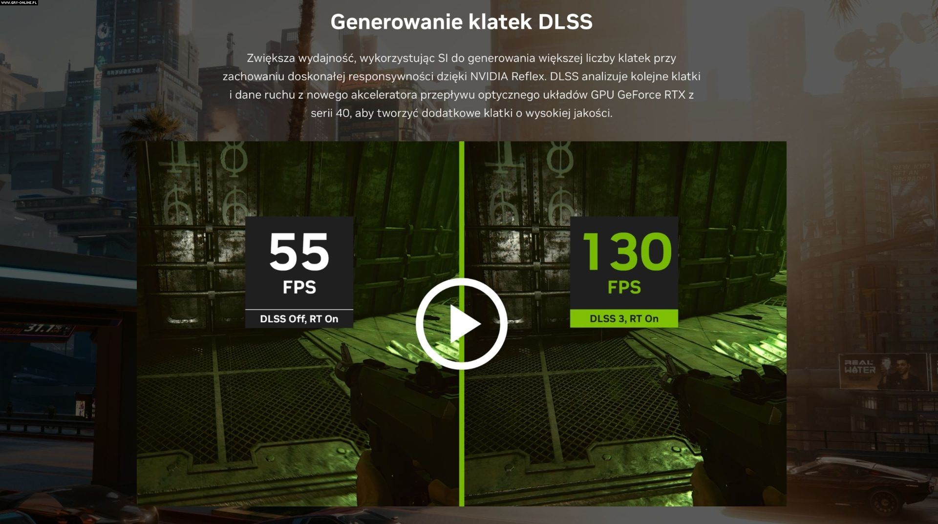 Co to w ogóle jest DLSS i generowanie klatek? W poprzednich generacjach kart graficznych RTX 20 i 30 DLSS (Deep Learning Anti-aliasing) ograniczał się do skalowania rozdzielczości obrazu, co rzeczywiście zwiększało płynności, ale kosztem pogorszenia jakości obrazu. DLSS w wersji 3.5 dostępny w kartach RTX 40 robi to już o wiele lepiej, a do skalowania rozdzielczości i “rekonstrukcji promieni” doszło jeszcze generowanie klatek: