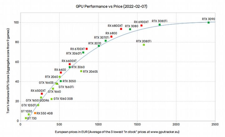 Zestawia on średnią cen ze strony www.gputracker.eu z wynikiem wydajności z portalu Tom’s Hardware.