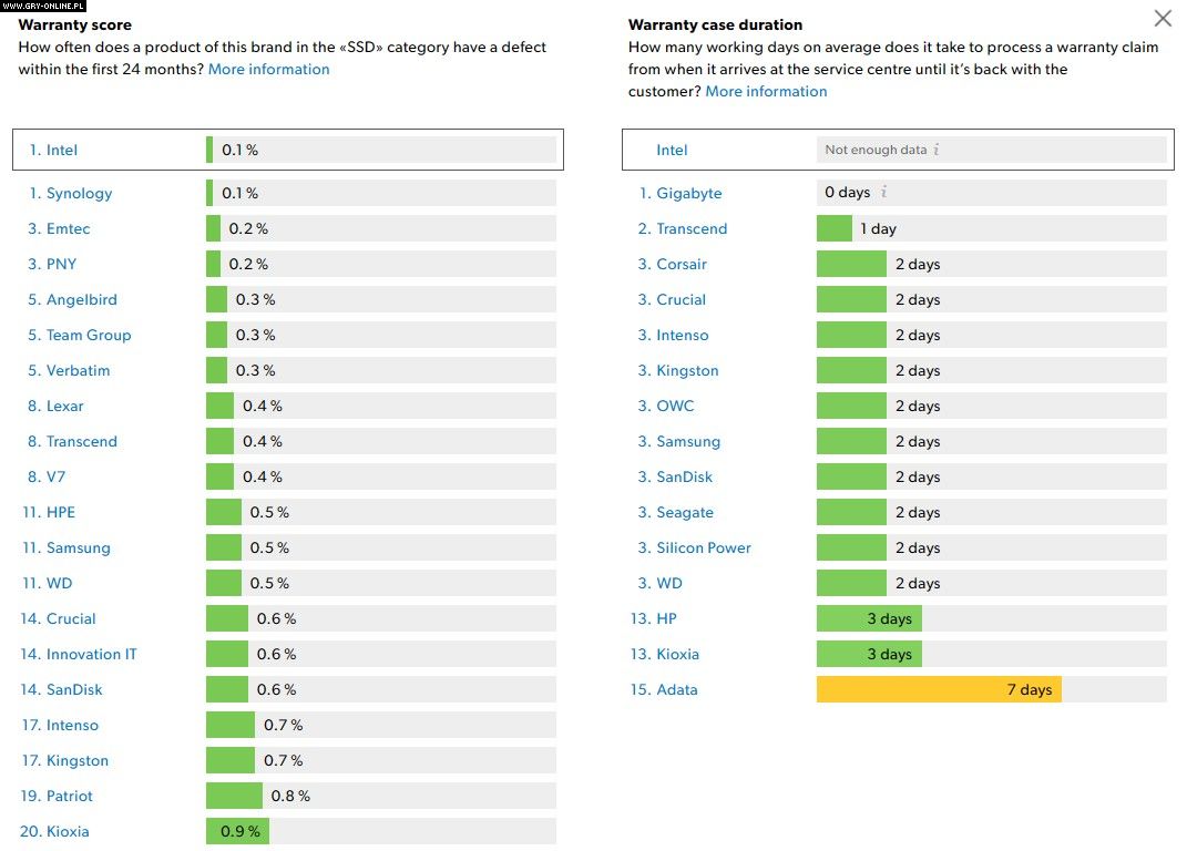 W tej kategorii prym wiodą Intel, Synology i Emtec. Ale warto zauważyć, że ogólna awaryjność i procent zwrotów dysków SSD są bardzo niskie – każda pozycja listy z wynikiem poniżej 1 procenta. Dla porównania statystyka ta w przypadku tradycyjnych dysków wygląda gorzej:
