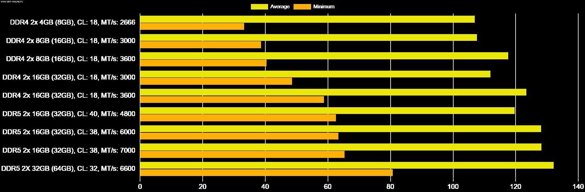 Przesiadka na 16 GB zapewnia nam znacznie większą stabilność w grach. To samo tyczy się 32 GB – świadczy o tym wykres z Hogwart’s Legacy. DDR4-3000 (2x16 GB) choć notuje mniejszą średnią ilość kl/s niż DDR4-3600 (2x8 GB), to jednak znacznie nadrabia minimalnymi wartościami (około 20% wzrost).