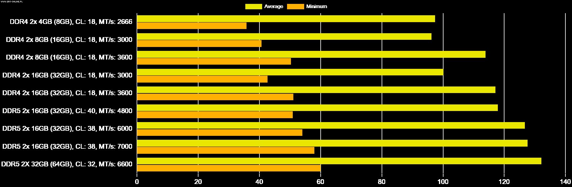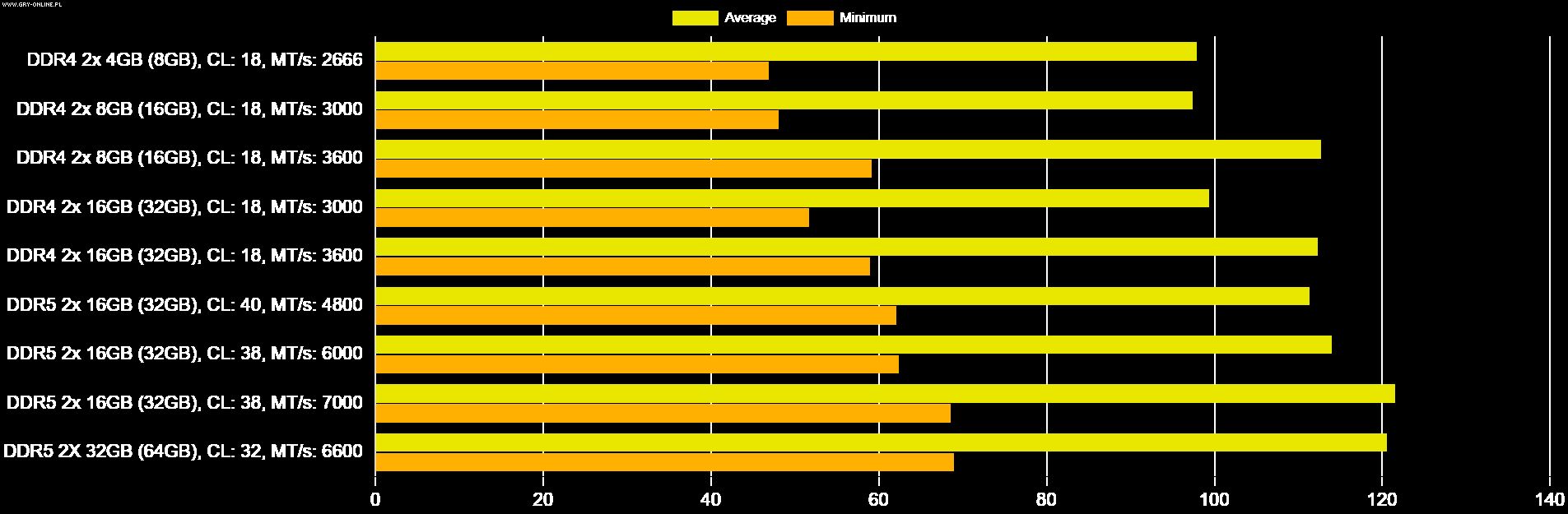 DDR5-7000 (2x16 GB) ma drobną przewagę nad DDR5-6000 (2x16 GB), tylko jeśli weźmiemy pod uwagę minimalną ilość kl/s. Dopiero DDR5-6600 (2x32 GB) oferuje w pewnym stopniu zauważalny przyrost wydajności, ale zapewne zawdzięcza to mniejszym opóźnieniom niż dwie powyższe konfiguracje kości (CL 32 kontra CL 38).